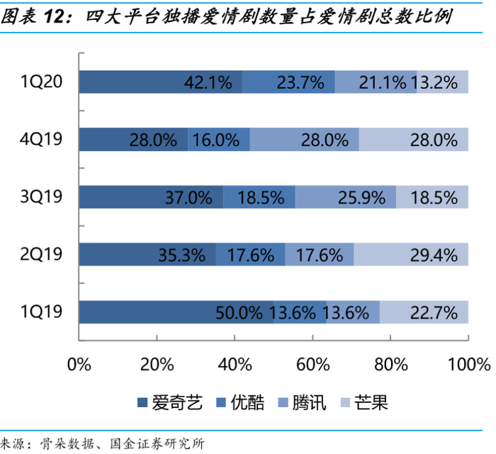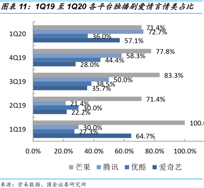 ①芒果TV独播剧爱情品类占比达70%以上,远超其它平台。随着上线剧集总数呈上升趋势,4Q19相比4Q18同比增长117%,我们认为,未来芒果TV独播爱情剧在爱情剧市场上的占比会进一步扩大,与爱优腾形成竞争。