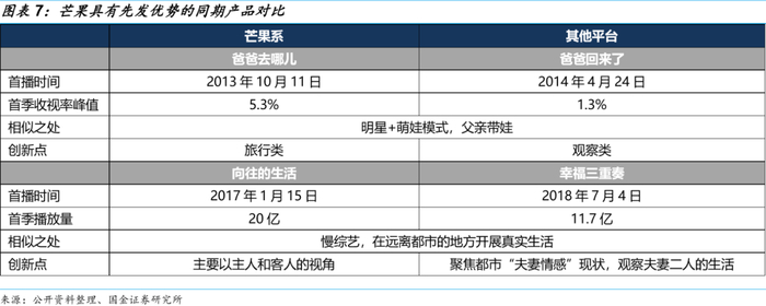 芒果的创新能力不仅体现在可以不断推出新的选题,也体现在,在同期相似选题后,可以进一步创新,做得更好。在芒果TV创新综艺选题出现爆款之后,类似选题的综艺层出不穷;但在市场表现上,均未赶超芒果。以《向往的生活》为例,其播放量达到20亿,而在此之后出现的相同题材的《幸福三重奏》,播放量仅为11.7亿。同时,在其他平台综艺选题火爆之后,芒果也能在此基础上不断创新。以《歌手》为例,与《中国好声音》同为音乐竞技类综艺节目,却通过将素人换成已有一定代表作的明星,开发新的看点。