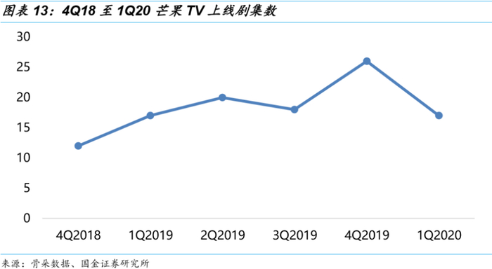 芒果TV爱情品类占比保持在70%以上,随着上线剧集数量不断上升,有望与爱优腾形成竞争。根据骨朵数据,芒果TV 1Q19至1Q20爱情剧占比始终保持在70%以上,远超其它平台。并且,2019年,芒果TV独播爱情剧的数量在整个爱情剧市场上的占比高于优酷和腾讯,略低于爱奇艺。同时,自4Q18以来,芒果TV每季度上线剧集数量呈上升趋势,虽由于疫情影响,1Q20有所下降,但根据2020年排期表,2020年上线独播剧集37部,相较于2019年27部依然有所增长。因此,我们认为,未来芒果TV独播爱情剧在爱情剧市场上的占比会进一步扩大,与爱优腾形成竞争。