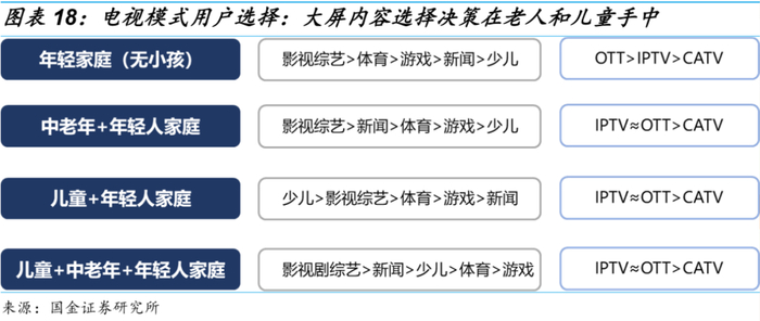 遥控器掌握在谁的手里,决定什么内容会被更多地选择。在分析用户大屏内容观看选择时,我们将国内家庭分为四类,分别是年轻家庭(无小孩)、中老年+年轻人家庭、儿童+年轻人家庭和儿童+中老年+年轻人家庭,内容主导权分别掌握在年轻人、老年人、儿童和老年人手中,相对应的年轻人和老年人对于影视剧综艺更加偏好,儿童对于以动画片为主的少儿内容更加偏好。除了年轻人家庭对于OTT需求更多外,其余IPTV与OTT偏好度目前没有明显差异。