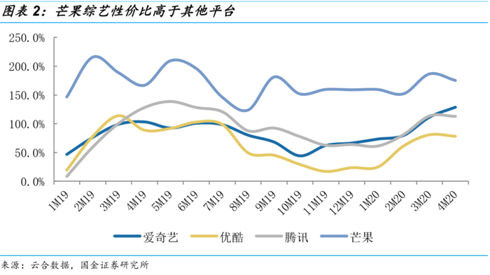 芒果综艺“性价比指数”保持在120%以上,持续高于其他平台。“性价比指数”:我们使用综艺节目市场占有率与用户权重之比来反映综艺节目的性价比。我们发现,1M19至4M20,芒果TV台网综的性价比持续保持在120%以上,相比于其它三大平台多数情况位于100%以下,芒果TV远高于其它三大平台,且优势长期稳定。说明其综艺质量较高,内容更具竞争力。