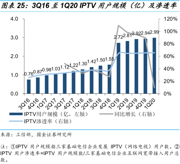 IPTV用户增长略显疲软,未来市场规模提高主要依靠ARPPU值提高。1Q20用户规模达2.99亿。由运营商发力大面积推广始于2016年,在2016年和2017年,中国联通和中国电信IPTV用户增长最为迅猛,2018年6月中国移动获批IPTV牌照加入,推动整体IPTV用户渗透率进入超60%时期。当前宽带转换IPTV用户数已趋于饱和,增速逐渐放缓,IPTV用户数在1Q20同比增速为9.9%。根据工信部统计,IPTV用户数/运营商宽带用户数在1Q20为65.6%。我们判断,IPTV从用户数量角度来看,其上涨空间相对已较为有限。