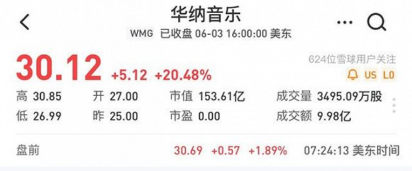 纽约时间6月3日晚,华纳音乐在纳斯达克挂牌上市(股票代码WMG),以25美元每股的价格出售了7700万股,募集资金约19.3亿美元。开盘价27美元/股,上涨8%。收于30.12美元/股,涨幅超20%,盘中涨幅一度超过23%,市值达到了153.61亿美元。