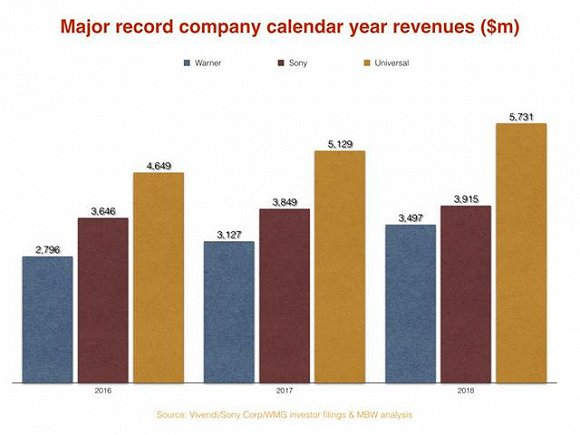 华纳音乐表示,在公司总营收中,通过授权数字音乐发行渠道所获得的收入占比例越来越高。在2019财年,公司通过给Apple和Spotify授权数字音乐所获得的收入占总营收的27%。2019年,流媒体音乐的总收入增长了19.9%,达到了88亿美元,占唱片总收的79.5%。