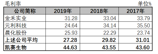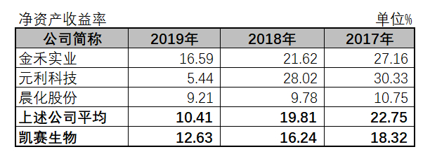 归根结底,凯赛生物的最终产品面对的是精细化工市场。对比现有的精细化工企业如金禾实业、元利科技、晨化股份,可以发现凯赛生物的毛利率相对较高;但净资产收益率(扣非后)也并不突出,近三年甚至还逐年下降。