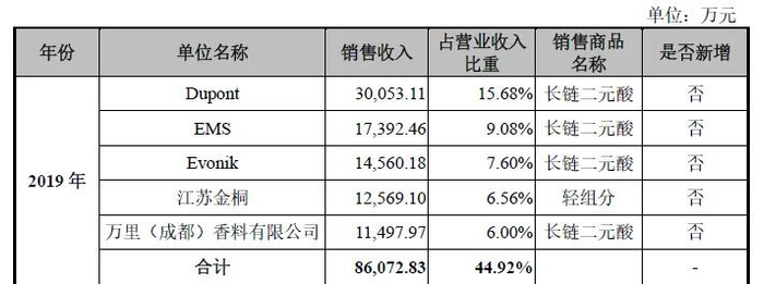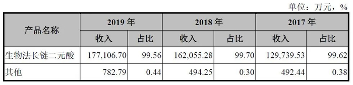 2019年公司收入99.56%都是长链二元酸这一单一产品系列。