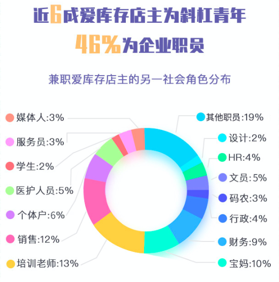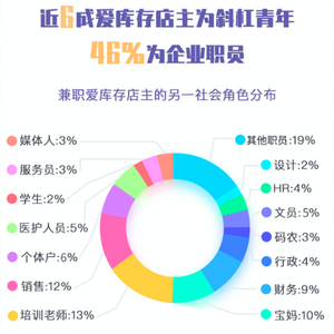 事实上,除了开网店以外,58.77%爱库存店主还有多重人生。据数据显示,在兼职爱库存店主中,13%为培训教师、5%为医务工作者、3%为媒体人。此外,近半数店主为企业员工,其中不乏程序员、设计师、财务等白领人群。正是因为爱库存“低门槛、低成本、零囤货”的优势,吸引了大量各行各业中的兼职店主,他们可能就是你身边的企业高管、房产中介、甚至驾校教练。