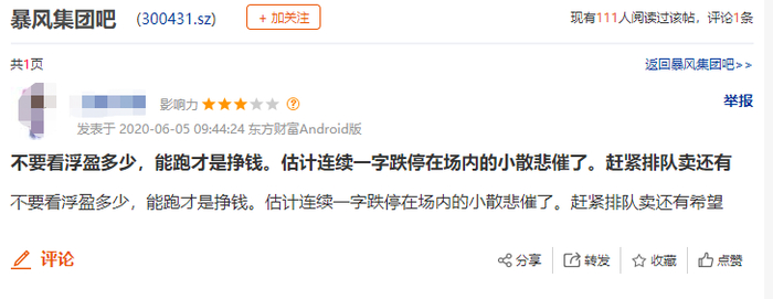 在大笔资金出逃之外,股吧里的股民也吵开了花。既有人声称早上溢价涨停价买入,并称系“某方财富通的客服让其早盘全仓买入”;也有人耐心劝说,“不要看浮盈多少,能跑才是挣钱”。在一众幸灾乐祸者、全能先知者、自怨自艾者、斗志昂扬者的杂糅之下,更有大批股民留言称准备“关灯吃面”,一时间股吧内情绪颇为复杂。