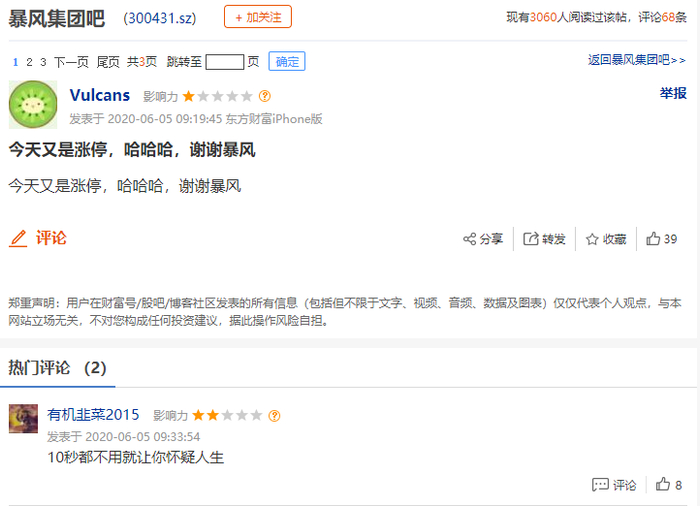 “今天又是涨停,哈哈哈,谢谢暴风!”——“10秒都不用就让你怀疑人生……”两名股民在股吧一前一后的对话,正反映出6月5日暴风集团股价走势的玄幻。