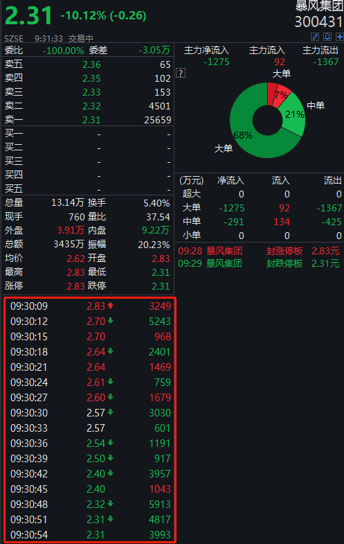 6月5日,暴风集团继续开盘涨停。然而,正当无数股民还做着连板的梦时,短短几秒,多笔卖出大单即将股价砸至跌停,直接出现天地板。6月5日收盘,暴风集团以2.31元报收,当日跌幅10.12%,振幅达到20.23%。由于当日振幅超过15%,暴风集团再次登上龙虎榜。