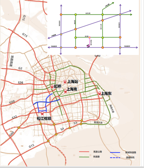 将充分衔接由“沪松公路、辰塔路、金玉路、辰花公路”组成的“井字型”新城快速路网和由“申嘉湖高速、沪昆高速、沈海高速、绕城高速高速”组成的“井字型”高速路网,使松江枢纽快速融入市域高快速路体系,实现松江枢纽与中心城区、虹桥枢纽、浦东枢纽、周边新城等快速交通联系,提升松江枢纽服务全市的辐射能力。