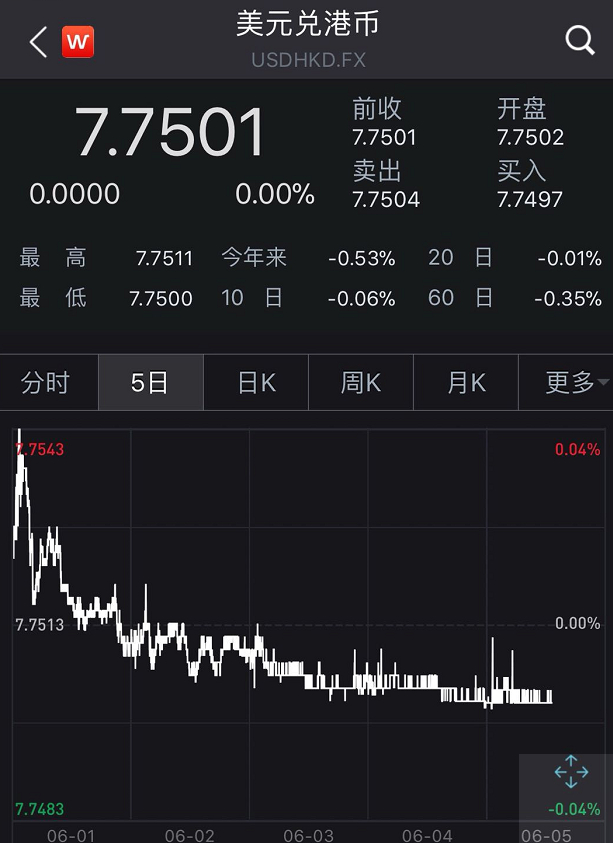 6月2日香港金管局总裁余伟文撰文称,过去数天港元市场一直运作正常,港元息率维持低企,港元汇价保持稳定,根据数间大银行所提交的最新数据,过去数天的存款亦保持稳定。这些均清楚显示目前并没有大量资金流出港元或银行体系。
