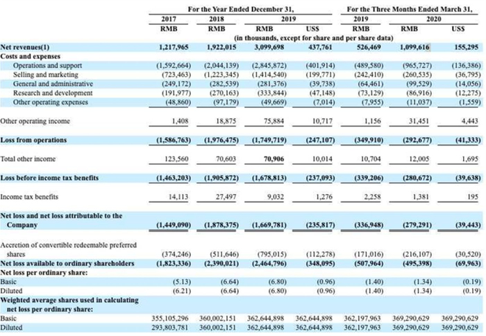 招股书显示,达达集团在2017年至2019年的净收入分别为12亿元、19亿元、31亿元;净亏损分别约为14亿元、19亿元、17亿元。2020年一季度,受新冠疫情影响,消费者对线上日常购物需求激增,达达集团录得营业收入11亿元,较去年同期翻倍;净亏损约为5亿元,较2019年一季度缩减约2%。