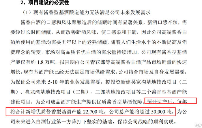 招股书显示,目前郎酒酱香型基酒产能1.8万吨,产能利用率已达94%,本次募投项目预计新增产能2.27万吨,加上吴家沟等其他在建项目,酱香基酒整体产能将超过5万吨;浓香型基酒已建成产能1.8万吨,募投项目建成后也将超过5万吨。