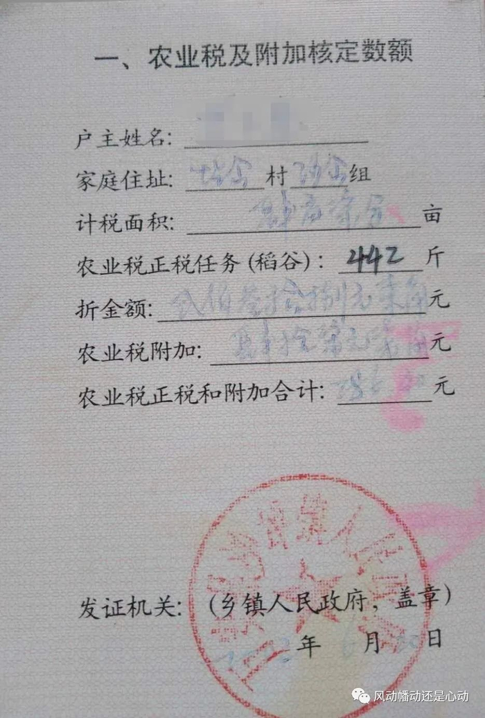 2002年老家调整过一次土地分配,加上家里一些变化,土地承包面积调整为4亩7分地。农业税正税任务(应该是公粮)442斤,如果不交公粮可以交钱,折金额243.87元。农业税附加47.7元。