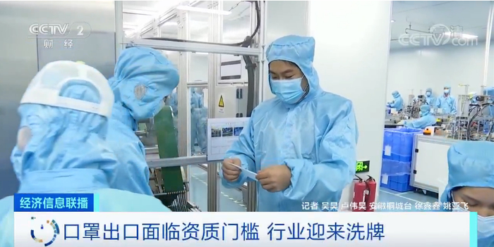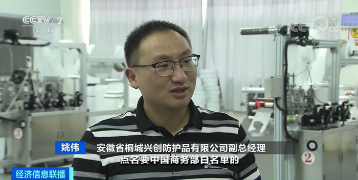 安徽省桐城兴创防护品有限公司副总经理 姚伟 :国外的一些客户点名要中国商务部白名单企业生产口罩,我们早在一个月之前,积极申办欧盟CE认证和国内商务部白名单。