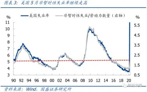 美国劳工部自3月以来的就业报告中均指出:被调查者若由于疫情影响暂性脱离工作岗位,应填报为“暂时性失业”,但很显然并非所有调查者均按此填报,许多这种状况的劳动者填报为“被雇佣,但由于其他原因暂时停工”。根据美国劳工部估算,若将这部分劳动者划定为失业,则3月、4月、5月的实际失业率将比公布数值分别提高1、5、3个百分点。因此,由于疫情对就业的扰动,叠加美国政府对就业市场的支持政策,近期美国失业率数据已些许“失真”。