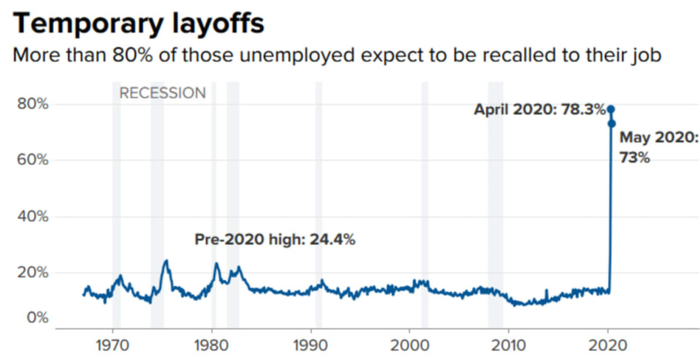 新冠疫情爆发以来,停薪留职是美国许多公司采取的削减成本的对策。统计局表示,截至5月中旬,在总共失业的2100万美国人中,有1500万人(约占73%的比重)是处于停薪留职状态