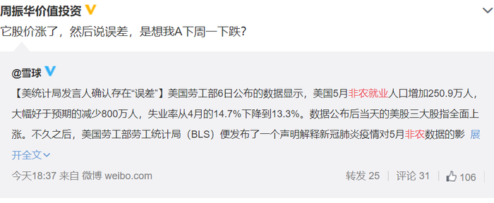 当天公布的5月美国非农业部门就业岗位环比增加250万个,非农失业率从4月的14.7%降至13.3%,经济学家此前认为,随着新冠疫情造成大规模经济停顿和失业之后,美国5月的失业率会接近20%。