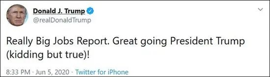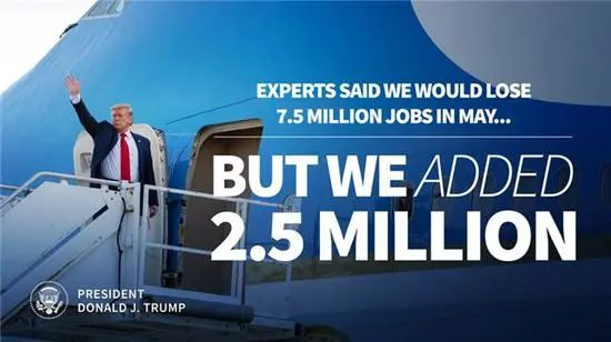对于这份经济数据,在疫情远未得到控制之际便全力推行复工的特朗普,已经难以掩饰其喜悦之情。特朗普在推特上骄傲地表示,250万是美国历史上单月就业最大增幅:“我们是第一!”