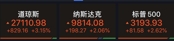 6月5日,美股大幅走高,纳指刷新盘中纪录高位报9845.69点,收在9814.08点,涨幅2%,而道指盘中暴涨逾千点,收报27110.98点,上涨829.16点,涨幅3.15%;标普500指数收于3193.93点,上涨81.58点,涨幅2.62%。