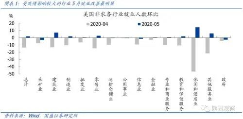 美国5月非农报告的调查时间为5月16日前一周,截至5月15日,美国已有31个州+DC特区结束“禁足令”,这些地区的GDP合计占比为62.4%。与4月相比,5月暂时性失业人数下降272万,反映了经济重启后,一些岗位的工人被雇主召回。分行业来看,前期受疫情影响较大的休闲和酒店、教育和保健服务、其他服务、建筑、零售等行业在5月就业状况改善最为明显。