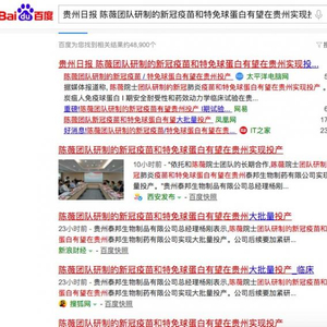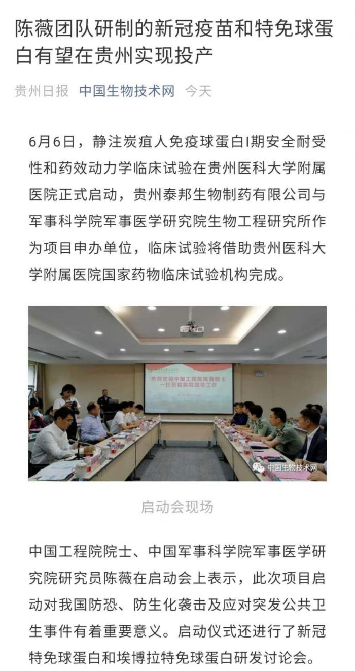 6月7日,一则“陈薇团队研制的新冠疫苗和特免球蛋白有望在贵州实现投产”在网络上流传,中国生物技术信息网官方微信平台中国生物技术网也转发了信息源为贵州日报的信息(标题同网络流传)。