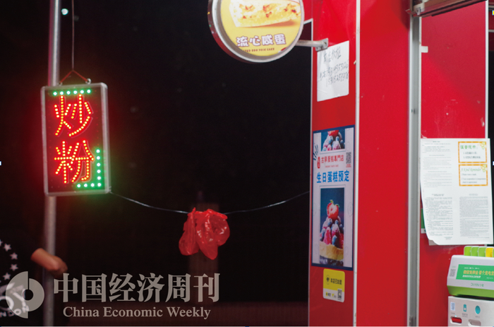 10点以后,白天卖着小蛋糕的铺子亮起了“炒粉”的灯,一位大叔站在门口熟练地抓起一把豆芽放进热气腾腾的锅里。