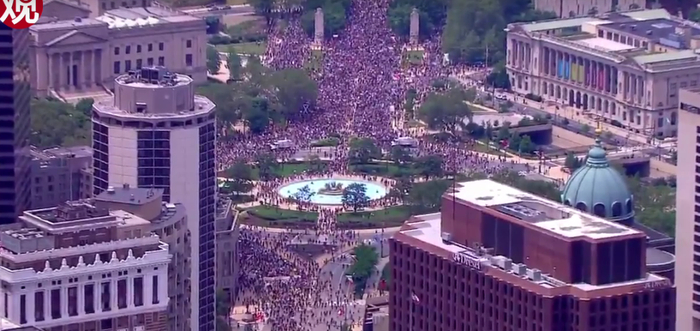 美国费城的航拍视频显示,密密麻麻的抗议者挤满了主干道。抗议者从该市艺术博物馆开始,游行至市政厅,还高喊“无正义无和平”、“拒绝种族主义警察”等口号。
