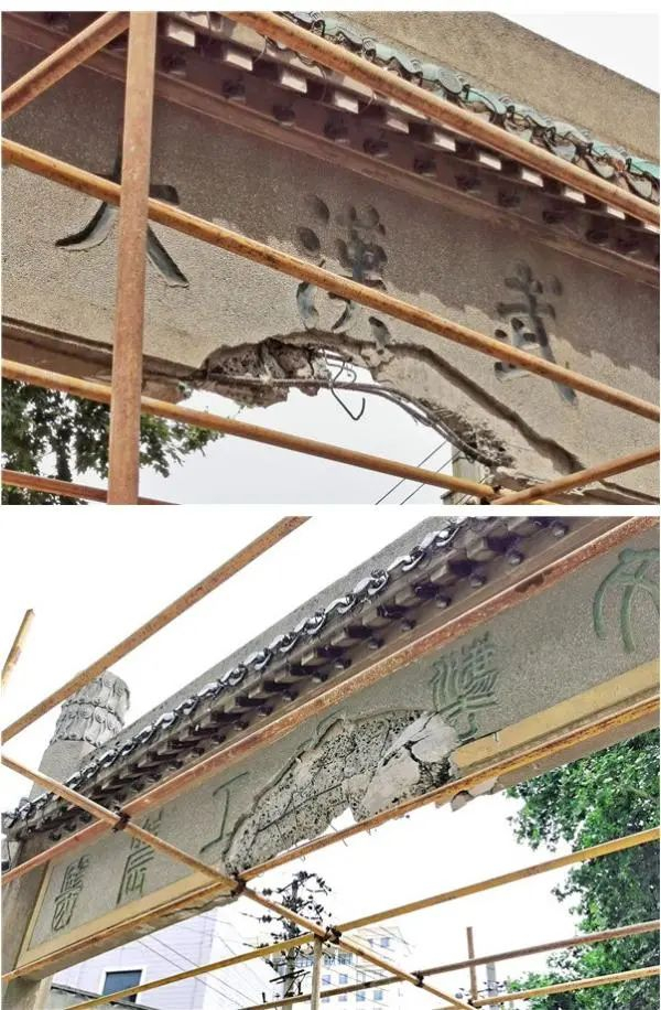 在这15处国保单位中,14处都位于今天的武大校园内,唯独国立武汉大学牌坊一处,孤悬校外数里远处。正因如此,这一建筑与校内的其他14处建筑相比,境遇可谓霄壤之别。在位于校园内的各校舍建筑陆续得到妥善保护和修缮之时,地处街道口闹市之中的老牌坊,不仅几无人知,其周边环境和保护状况,也与“国保”身份极不相称。在发生此次严重撞损时间之前,老牌坊明间的门柱落地处,已发生过多次汽车擦碰,伤痕累累。而周边餐饮门店产生的油污等,更是多年来持续污损老牌坊的表面。