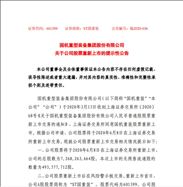 6月8日,曾经主动退市的A股第一股二重重装变身国机重装(简称ST国重装,代码601399)正式重返A股上市交易。6月7日晚间,ST国重装发布公告称,公司于2020年3月13日收到上交所的《关于国机重型装备集团股份有限公司人民币普通股股票重新上市交易的通知》,上交所同意公司股票重新上市。公司股票将于6月8日在上海证券交易所重新上市。公司股票重新上市后在风险警示板交易。重新上市首日,公司A股股票简称为“ST国重装”,股票代码为601399,公司股票价格不设涨跌幅限制。这意味着,公司4.82万户股东将享受从股转中心跨越到沪市主板的巨大利好。