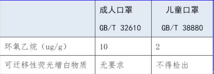 第三,安全性能。考虑到儿童肌肤娇嫩、风险意识较弱,与成人口罩相比,儿童口罩在口罩设计中对可能机械损伤性能方面要求更高,如鼻夹、呼吸阀等都规定了较高的要求,除此之外化学物质限制使用也提高了要求。比如,一种用于杀菌的化学物质环氧乙烷,儿童口罩标准就极大的提高了环氧乙烷残留量限值的要求,规定的限值是不超过2μg/g,比成人口罩低很多;而且,符合标准的儿童口罩绝不允许检出可迁移性荧光增白物质。