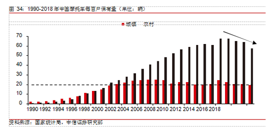 国内摩托车保有量已饱和,进入存量市场。我国摩托车整体保有量从 1990 年至 2014年不断上升,在 2014 年达到高点后逐年下降,显示市场已进入饱和状态。其中,农村居民保有量萎缩显著,考虑摩托车并不具有一车一户性,我国农村居民摩托车保有量已达到饱和;受限于摩托车路权限制,城镇居民保有量进入 21 世纪后已稳定在 20 辆/百户。随着居民收入增加,私人机动车保有量从 2004 年 1365 万辆增加到 2019 年 2.07 亿,增长 14 倍以上,代步摩托车需求不断弱化,目前城乡摩托车需求均已接近饱和。