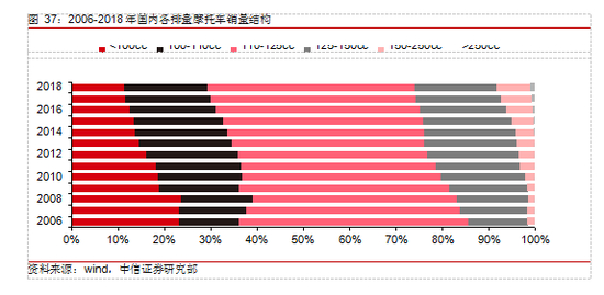 消费升级带动行业结构变化,摩托车从代步工具向娱乐消费型转变。近年来由于禁摩令存在,我国摩托车上路受到限制,摩托车作为代步工具的交通属性逐渐淡化,小排量摩托车市场日渐衰退,小于 125cc 排量的摩托车占比逐年下降,其中小于 100cc 排量摩托车型下降最快;另一方面,随着消费升级,摩托车娱乐属性逐渐开始凸显,大排量摩托车动力充足、速度上限高,逐渐受市场认可,250cc 及以上排量摩托车型占比逐年提升,渗透率和单车价值量均快速提升,迎来高速增长。