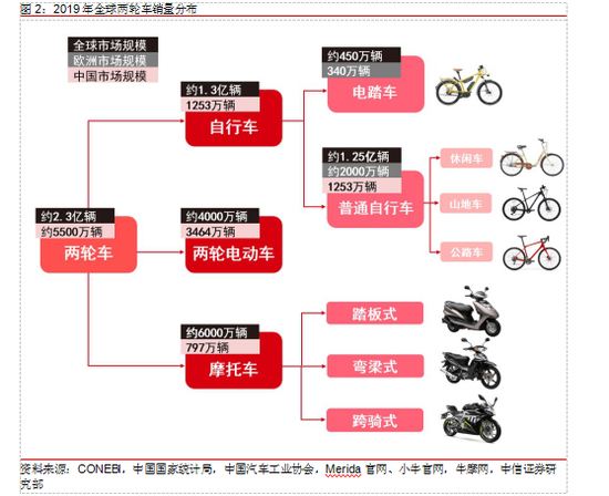 我国是两轮车生产、消费大国。两轮车按照动力来源可分为自行车、两轮电动车、摩托车等三类。两轮电动车又称小电驴、电动自行车(此处不含电踏车);自行车又分为电踏车(必须踩踏,电力仅做辅助)和普通自行车。作为机动车和公共交通的有力补充,两轮车是交通系统末梢重要的交通工具,全球消费总量达到 2.3 亿辆,我国 2019年产、销量分别高达 1.1 亿辆(两轮电动车约 3600 万、自行车约 5400 万、摩托车约2000 万)和 5500 万辆(两轮电动车约 3500 万、自行车约 1200 万、摩托车约 800 万)。以传统交通工具属性为主的两轮车目前在国内和全球都面临量、价的增长平台期, 但在相应领域均出现了因消费升级而产生的结构化高速增长新赛道。