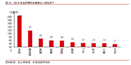 日本、欧美厂商收入居高,占据产业链高端空间。2018 年,全球摩托车销售收入排名前十的企业中,日本制造商本田、雅马哈、铃木、川崎占据 4 席,印度品牌英雄、TVS、