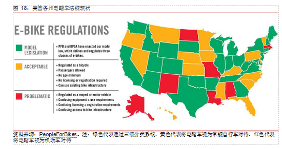 美国电踏车法律地位逐渐明确,有望再造一个欧洲市场。相比电踏车耕耘多年的欧洲市场,美国正处于电踏车变革的开端,据 ECycleElectirc 估计,美国目前约有 120 到 150个品牌推广电踏车。在美国,有关电踏车的法规由州政府各自制定,在全美范围内没有一致的法规是影响其电踏车市场发展的一大障碍。作为一种新兴产品,电踏车需要明确的法规来规范其使用并在市场上创造稳定性。美国电动自行车委员会正在积极地推动各州实行统一的“三级分类系统”,该系统定义了电踏车的类别和使用要求,目前已有近 30 个州通过了该方案,为电踏车市场的蓬勃发展提供了保障。美国最大自行车品牌 Trek 的总裁 John Burke 在 2019 年 2 月写给行业的公开信中指出,未来美国电踏车占自行车行业的比重可达 30%甚至更高,届时将再产生一个比肩欧洲的电踏车市场。