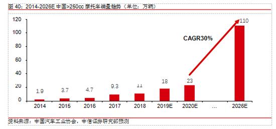 我国大排量摩托车市场容量有望达 100 万辆。考虑国内外文化差异和政策引导的影响,我们估算未来销量口径国内渗透率在 7 辆每万人左右,对应年产量约 100 万辆。国内大排量摩托车销量 2011-18 年复合增速 47.4%,随着消费升级行业结构变动,估计未来 6 年内行业复合增速将维持在 30%以上。2026 年大排量摩托车市场容量有望达 110 万辆,相比2018 年销量 10.6 万辆我国大排量摩托车约有 10 倍成长空间,增量空间巨大。