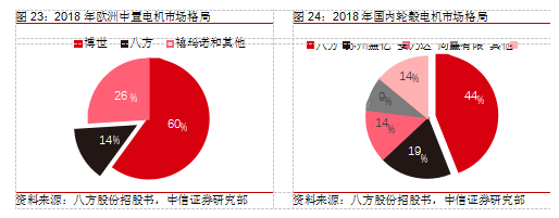 电踏车电机集中度更高,中置电机由国际巨头主导,轮毂电机以国产为主。作为电踏车电气系统的核心,电机主要分为中置电机和轮毂电机两种。轮毂电机安置在轮毂处,搭配速度传感器,成本低,易于拆卸,主要配备在中低端电踏车和共享电踏车上。中置电机的单机价格明显高于轮毂电机,一般搭配力矩传感器,能适应复杂地形,更加稳定可靠, 主要应用于高端电踏车市场。2018 年,博世主导了欧洲中置电机市场,市场份额达到 60%, 国内龙头供应商八方股份在欧洲中置电机市场上的占有率大约为 14%,超过禧玛诺位居第二。中国是全球轮毂电机主要生产基地,已经形成了完整的产业链,在成本、响应速度、售后服务等方面具有较大优势,具备与国际巨头同台竞争的实力。