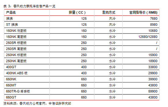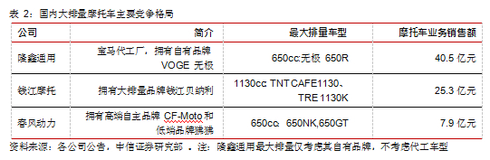 国产品牌隆鑫、钱江、春风动力开始发力大排量摩托车。隆鑫从 2005 年开始为宝马650 发动机代工,积累了丰富高端工业制造经验,于 2018 年推出自有品牌 VOGE 无极,专注驾驭美学,在科技、性能、外观、耐久方面给消费者以最佳体验。钱江摩托于 2005 年收购意大利摩托品牌贝纳利,是国内第一个与外资深入合作的企业。贝纳利提供了发动机、零件等让钱江摩托的制造技术提升了一个新的水平,也填补了钱江摩托缺乏大排产品的空白,同时钱江品牌形象获得了很大的提升。春风动力专注大排量摩托车水冷技术,拥有高端自主品牌 CF-Moto 和低端品牌狒狒,联手欧洲最大的摩托车厂商 KTM,优化公司大排量摩托车产品研发生产能力。