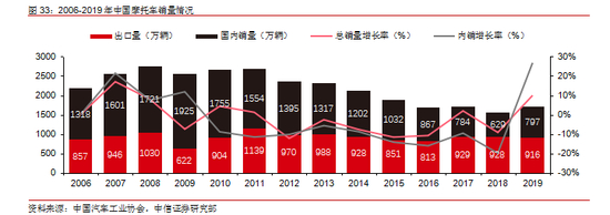 国内摩托车市场饱和,年销量约 800 万辆。国内摩托车市场在 2010 年前后达到高位,年产量 2700 万辆,之后由于受到禁摩政策、私家车普及、保有量接近饱和等因素影响, 市场表现持续下滑。我国摩托车出口量较稳定,国内销量逐渐下降。2019 年累计产量约1700 万辆,国内销量 797 万辆,连续四年销量不足 1000 万。