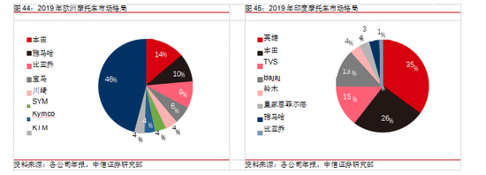 海外市场被老牌摩托车制造商瓜分。本田、雅马哈、铃木和川崎等四家日本制造商 2019年累计销量之和占全球摩托车市场的 40%。日系品牌在日本本土的市占率为 88%,在东盟的市占率高达 96%,在欧洲的市占率为 28%。印度是世界上最大的摩托车市场,年销量约 2000 万辆,其本土品牌英雄、TVS、Bajaj 的市占率分别为 35%,15%,13%,日系在印度的市占率为 33%。哈雷戴维斯、本田、雅马哈三家制造商占据了美国主要市场,美国人钟爱大排量摩托车,其市场上销售的摩托车中排量在 600cc 以上的占 90%以上,这其中又有 50%来自哈雷。