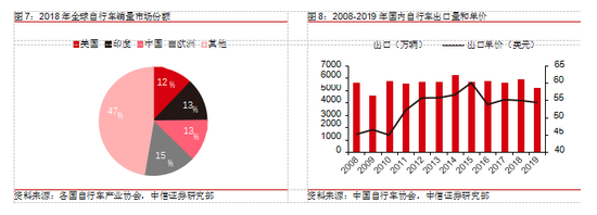 欧洲、中国、美国是自行车主要消费市场,中国产量占世界 50%。欧洲自行车总保有量约 2.5 亿辆,年需求量多年来保持稳定,年销量约为 2000 万辆,平均售价在 500 美元左右,市场规模达 100 亿美元。美国每年自行车销量在 1500~2000 万辆之间,市场规模 约 60 亿美元。我国是世界最大的自行车出口国,产量约占全球 50%,但目前出口量和单车价格已经达到平台期:2019 年国内出口自行车5251 万辆(同比-11.4%),出口额 28.5 亿美元(同比-12.4%);此外,新冠疫情席卷全球造成 2020Q1 自行车出口额 较去年同期下降 28%;与欧美市场的高 ASP 不同,国产自行车售价较低,出口 ASP 稳定 在 55 美元附近。