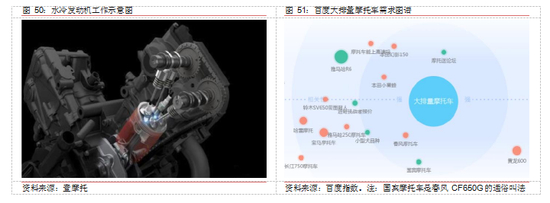 核心竞争力——大排量水冷技术。摩托车常见散热技术包括风冷和水冷两种,风冷发 动机在表面安装鳍片,通过骑行时候的风速来带走热量降温;水冷发动机在四周安装冷却管道,热量通过缸套传递给水道中的冷却水来实施冷却。大排量摩托车的散热量巨大,只有在水冷的高效散热下才能保持发动机热动力不发生衰竭。水冷发动机构造精密,制造难度大,攻克水冷技术是生产大排量摩托车的必备条件。