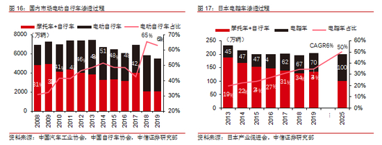 日本市场仍有增长空间,可望突破百万辆。日本电踏车的发展与我国市场上的电动自行车有相似之处,我们尝试参照国内两轮电动车渗透率变化及预测情况来估计日本未来的电踏车市场(我国 2016-2019 年,先后受共享单车、抢装超标车影响,导致渗透率偏移),预计到 2025 年,日本电踏车渗透率将从目前的 34%提升到 50%,目前日本两轮车市场保持在 200 万辆,届时日本电踏车年销量将达到百万辆。