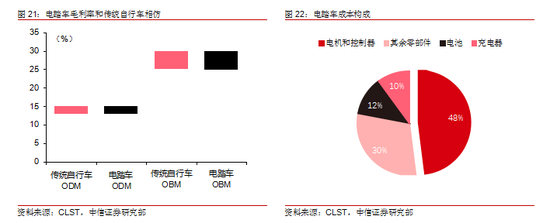 电踏车电机及控制器等核心零部件是电踏车主要增量成本,利润丰厚。据 CLST调查,虽然电踏车的平均售价远高于传统自行车,但是对于国内大多数的电踏车 ODM 制造商来说,相比传统自行车 ODM 13%-15%的毛利率,其电踏车 ODM 的毛利率也处于相同水平。主要原因在于电踏车 70%的成本来自于 PAS(电助力系统),而剩余自行车零部件只占 30%——这意味着 PAS 供应商带走了绝大部分增量利润。电踏车ODM 制造商仍旧愿意推广电踏车的原因有二:1)由于 ASP 更高,电踏车的绝对毛利润高于传统自行车;2)出货量的增加提高了 ODM 制造商的议价能力,伴随 PAS 价格下降,其成本也不断下降,可以预见未来更高的利润。