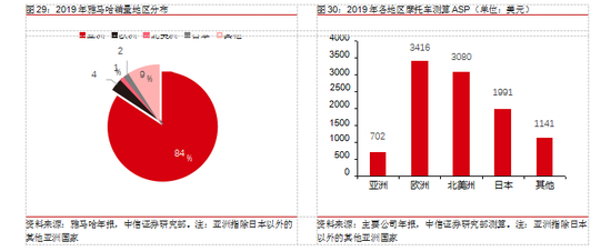 全球摩托车市场 ASP 差异大,欧美远高于亚洲。本田、雅马哈是世界前两大摩托车生产厂商,业务遍布全球。2019 年,本田摩托车更深入东南亚等亚洲市场,平均销售价格约 940 美元;雅马哈相较而言业务更侧重欧日等发达市场,平均销售价格约 1800 美元;印度最大的本土摩托车厂商英雄平均销售价格约 650 美元:根据销量结构,我们测算欧美地区处于产业链顶端,以大排量摩托车为主,ASP 在 3000 美元左右,亚洲地区销售的多为低价位小排量摩托车,ASP 远低于欧美日等发达市场,不同地区间销量结构差异巨大。