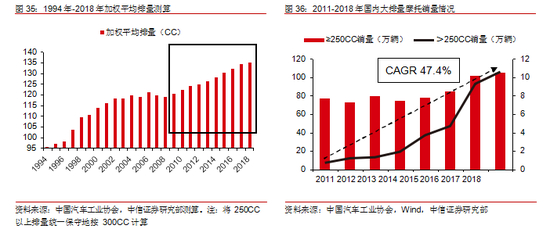 传统摩托车市场萎缩,大排量摩托车迎来放量。近年来摩托车总体销量不断下滑,但大排量摩托车销量却在逐年增长。我们以销售比例作为权数,将 50CC、110CC、125CC、150CC、250CC 和 250CC 以上这市场中最常见的六种排量进行加权平均,我们发现在平均排量的增长是长期趋势,且在 2008 年之后排量增长进入快车道。我国大于 250CC 排量级别车型销量增长尤为迅速,从 2011 年的 7000 辆增长至 2018 年的 10.6 万辆,CAGR 达到 47.4%。我们认为,大排量摩托车未来仍将处于高速发展态势,主要驱动力为 250CC 以上排量的高速增长。