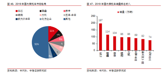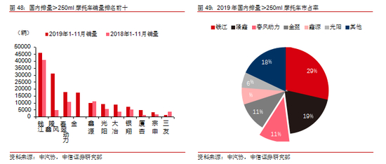 国内大排量市场集中度高,CR3 接近 60%。2019 年全国累计销售排量>250cc 摩托车 17.7 万辆,同比增长 67%。钱江、隆鑫和春风动力是国内生产销售大排量摩托车的主要厂商。2019 年 1-11 月,钱江、隆鑫、春风动力分别累计销售排量>250cc 摩托车 45931 辆、31155 辆、17742 辆,CR3 接近 60%。