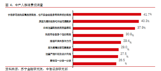 中产阶级规模扩大,品质消费成主流。我国中产人群的规模逐年增大,已经成为消费升级的主要推动力。根据苏宁金融研究院发布的 2019 年《中国居民消费升级报告》, “品质”、“服务”、“个性”、“外观”、“环保”是主要关键词,其中“宁愿花钱购买高品质商品, 也不买会给自身带来麻烦的商品”占比最高为 41.7%,可见中产人群对产品品质的关注度非常高。中产人群的收入普遍较高,消费理念已经从“价格第一”转变为“品质第一”,更加重视商品带来的情感需求,倾向于购买高品质、高性价比的商品。